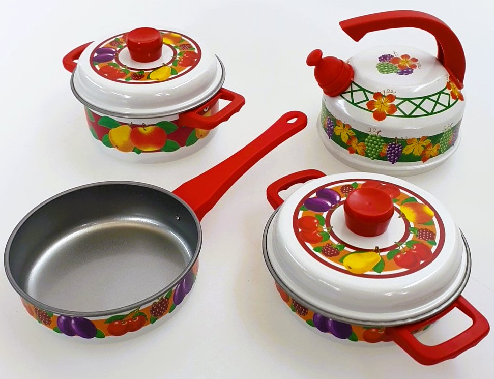 Sechsteiliges Kochgeschirr bunt bedruckt Typ -Obst- bestehend aus zwei Töpfen mit Deckeln, einer Pfanne und einem Wasserkocher Made in Germany
