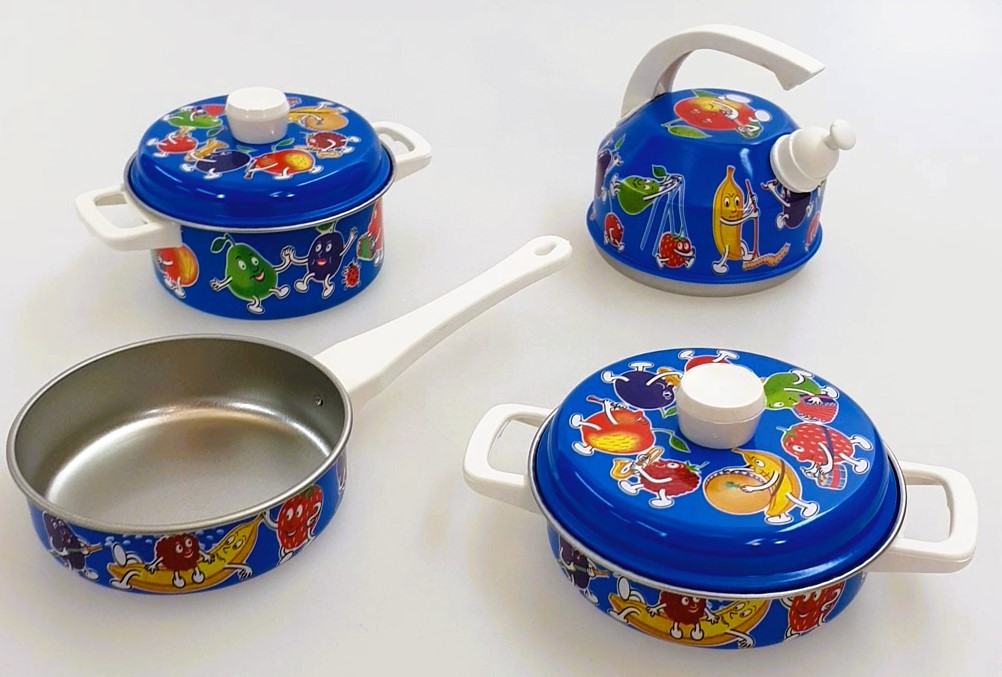 Sechsteiliges Kochgeschirr bunt bedruckt Typ -Früchte- in blau bestehend aus