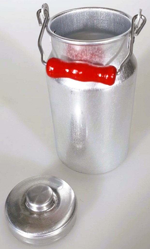 Set bestehend aus: kleiner Milchkanne mit Holzgriff 8cm, Milchtopf mit rotem Deckel 5cm und kleinem Kochtopf mit Deckel 6cm.
