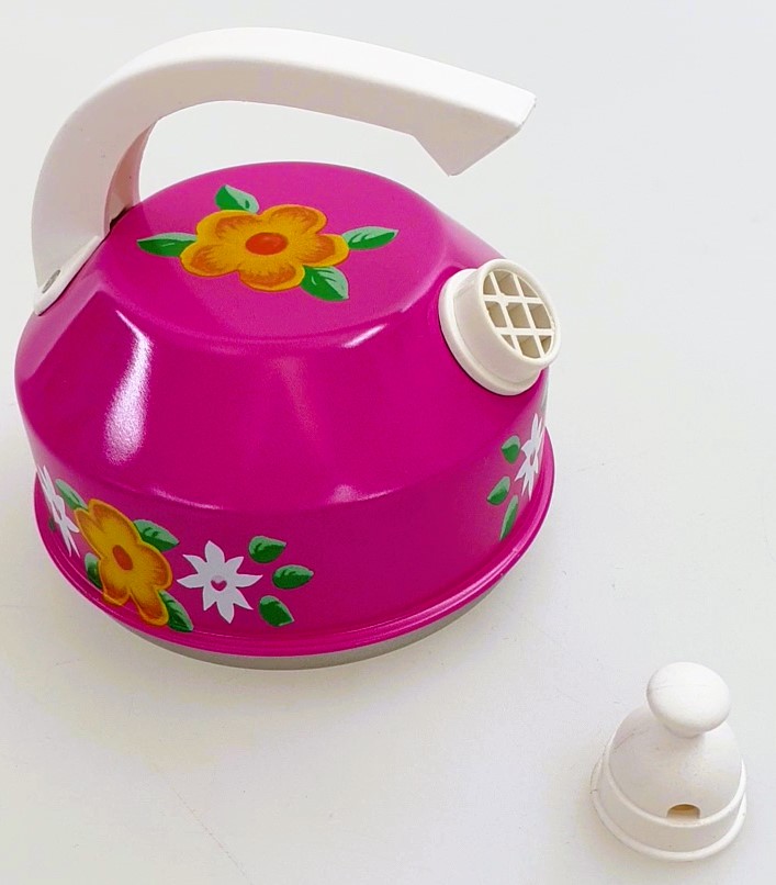 Sechsteiliges Kochgeschirr bunt bedruckt Typ -Blumen- in pink bestehend aus zwei Töpfen mit Deckeln, einer Pfanne und einem Wasserkocher Made in Germany
