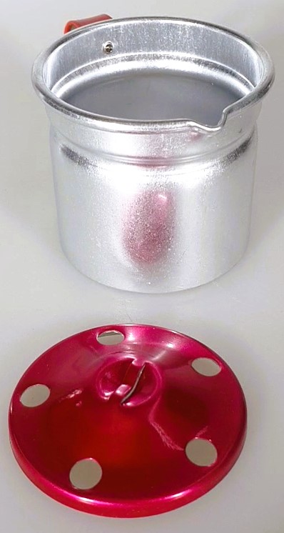 Set bestehend aus: kleiner Milchkanne mit Holzgriff 8cm, Milchtopf mit rotem Deckel 5cm und mittlerem Kochtopf mit Deckel 7cm.