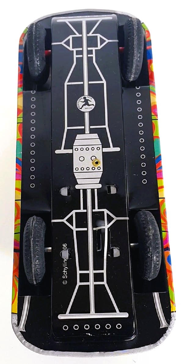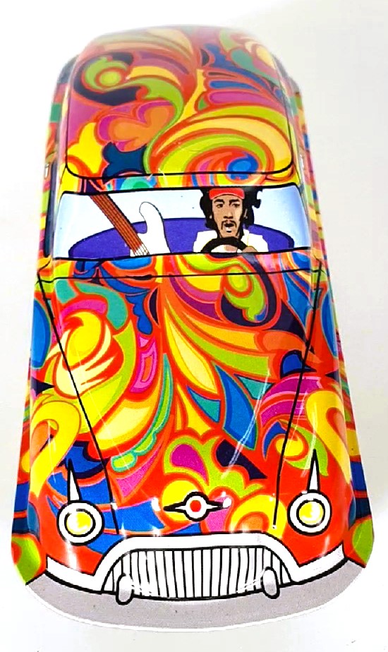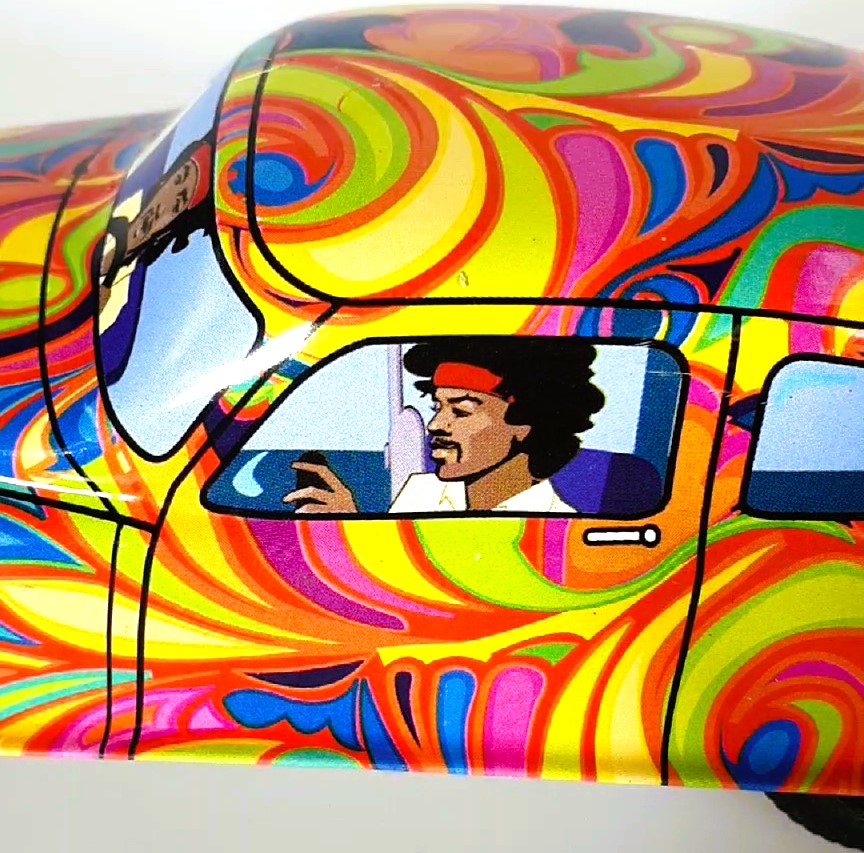 Sehr schön lithographiertes amerikanisches Hippieauto mit Jimmy Hendrix auf dem Weg nach Woodstock.