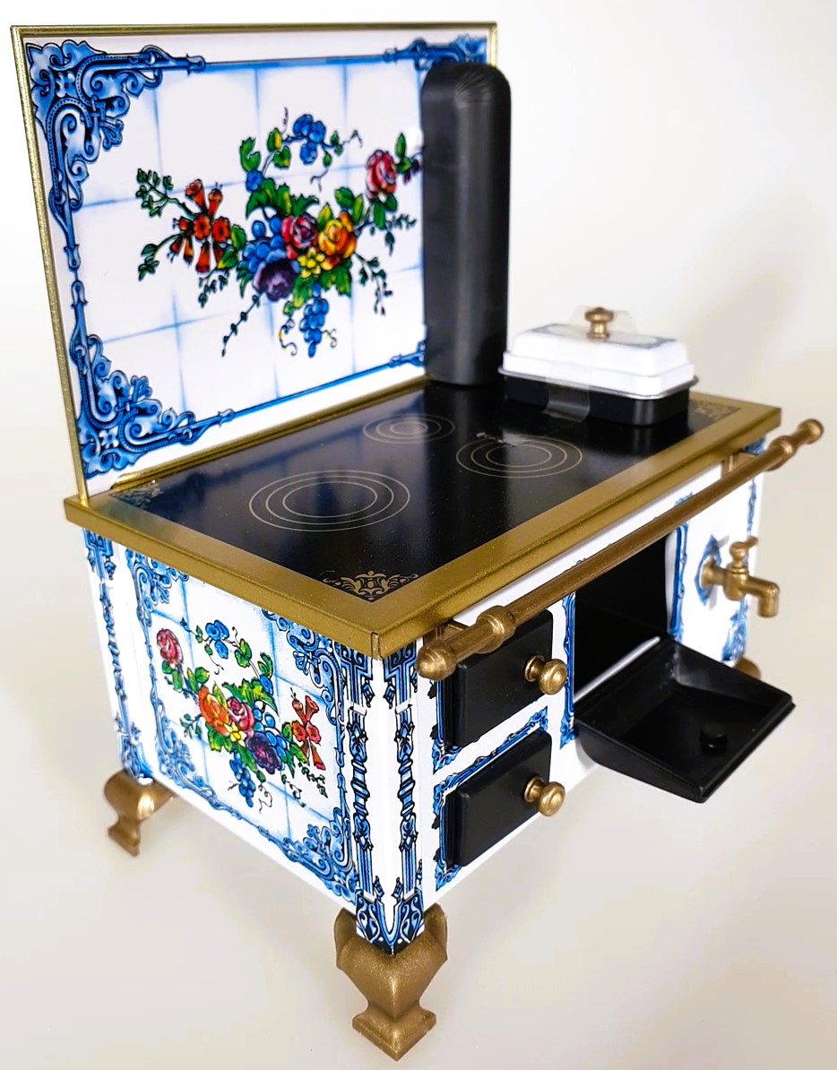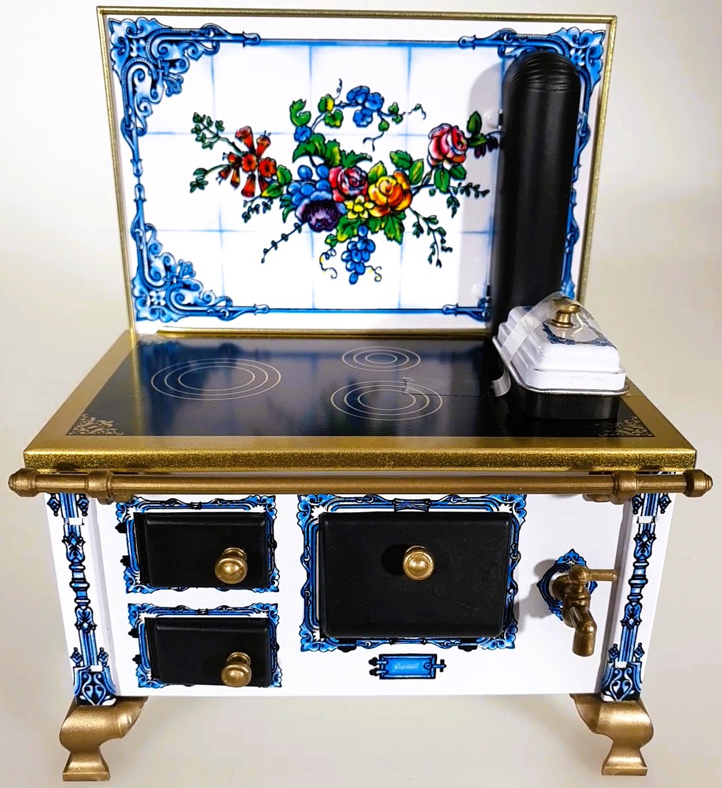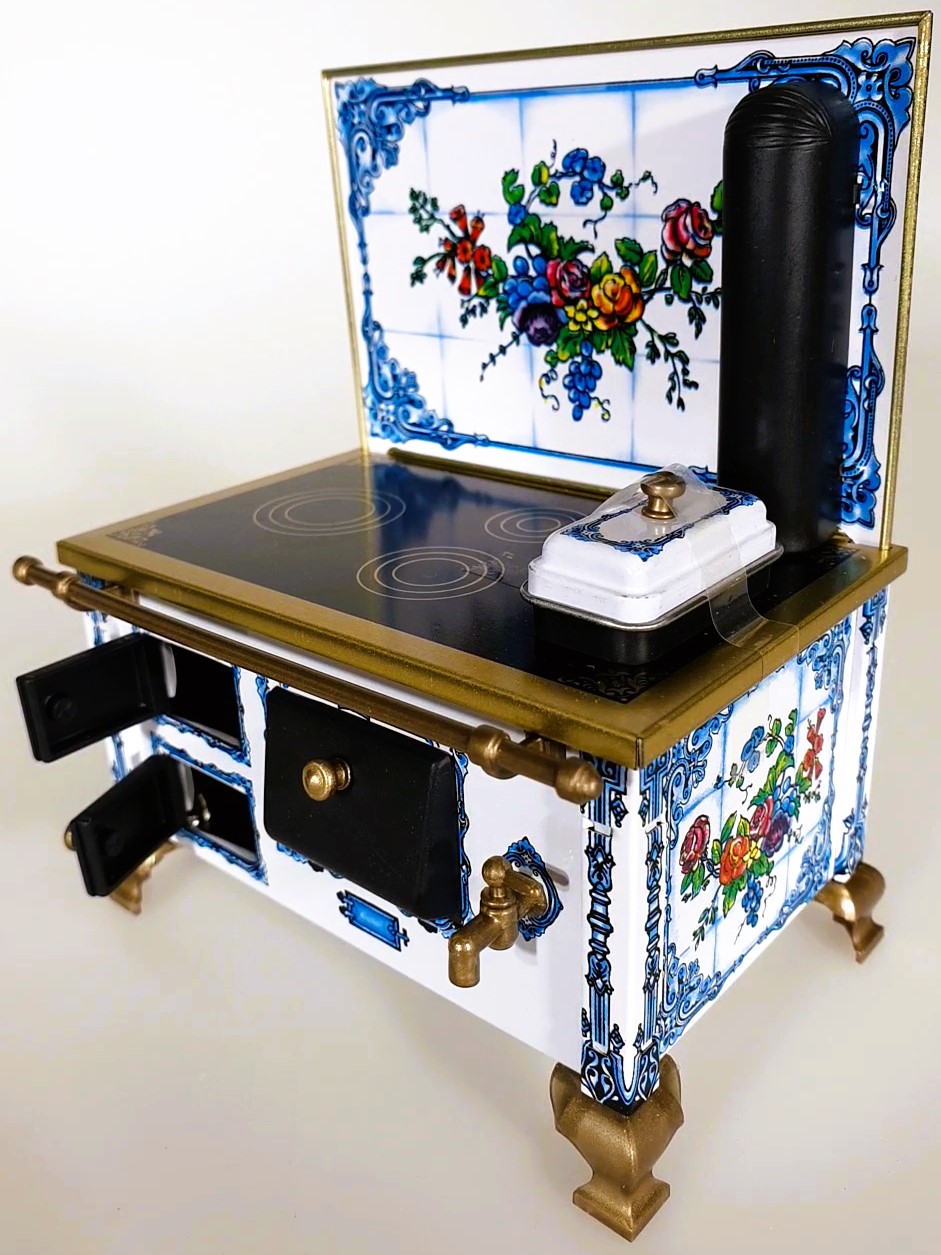 Beautiful blue dollhouse stove with flowers, 1:12 scale.
