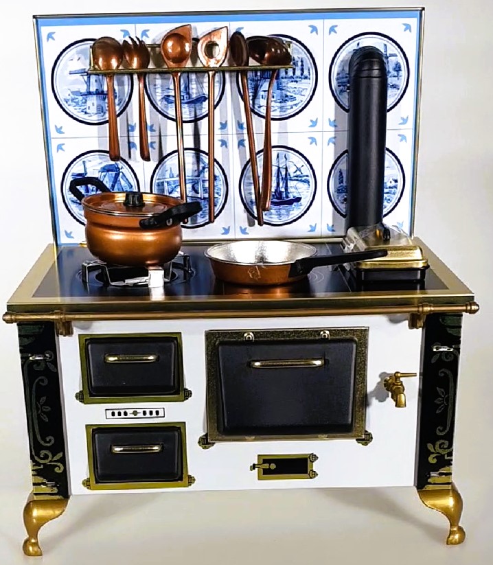 Fully functional vintage stove made of lithographed tinplate. Model-white with blue tiles-scale 1:6
